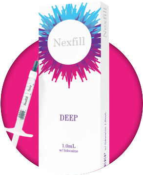 NEXFILL Deep is a thicker, longer-lasting dermal filler with results that typically last 12–18 months. It is best suited for treating nasolabial folds and for augmentation of the cheeks, chin, and lips, providing structure and definition with natural-looking outcomes.